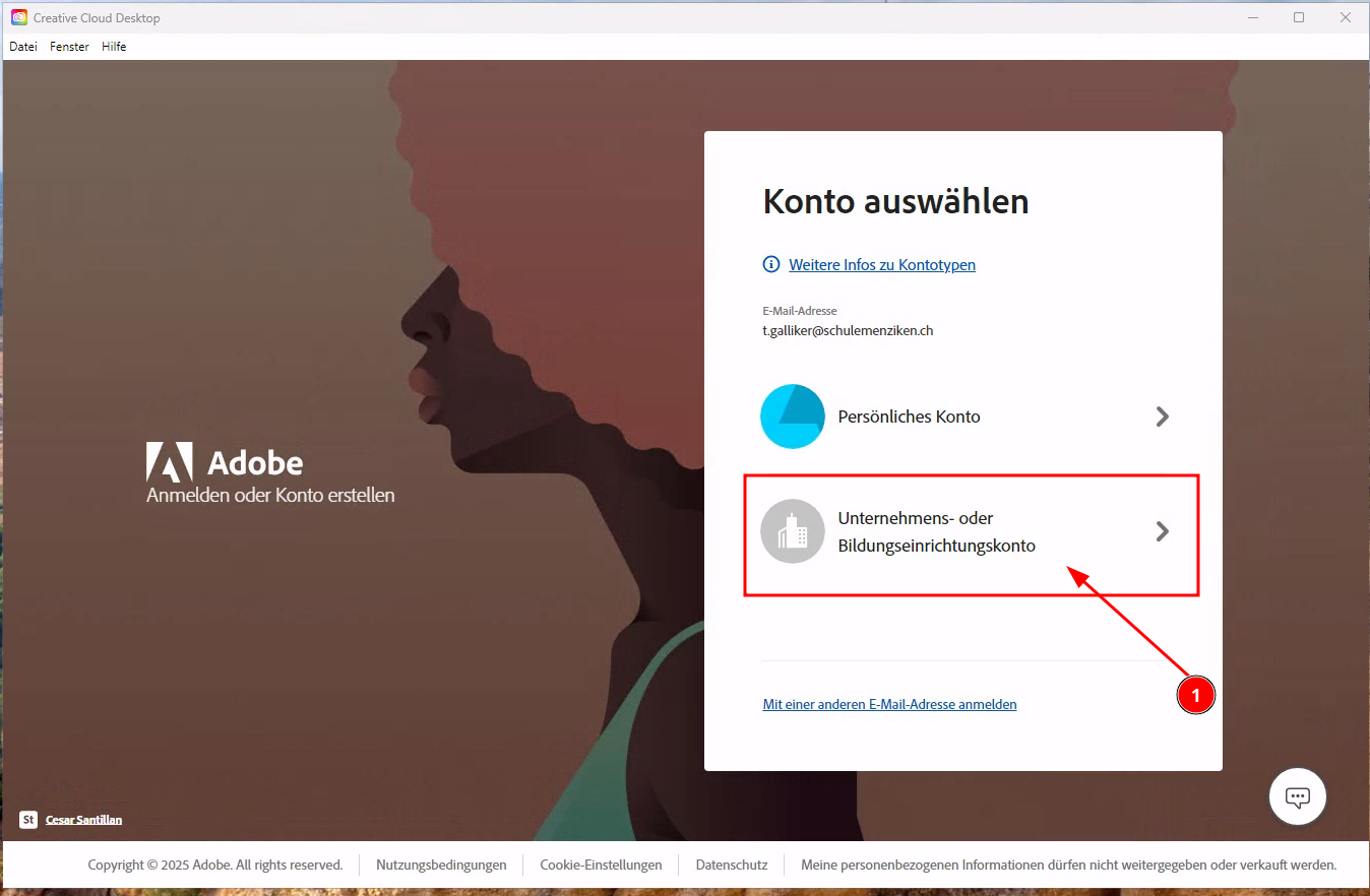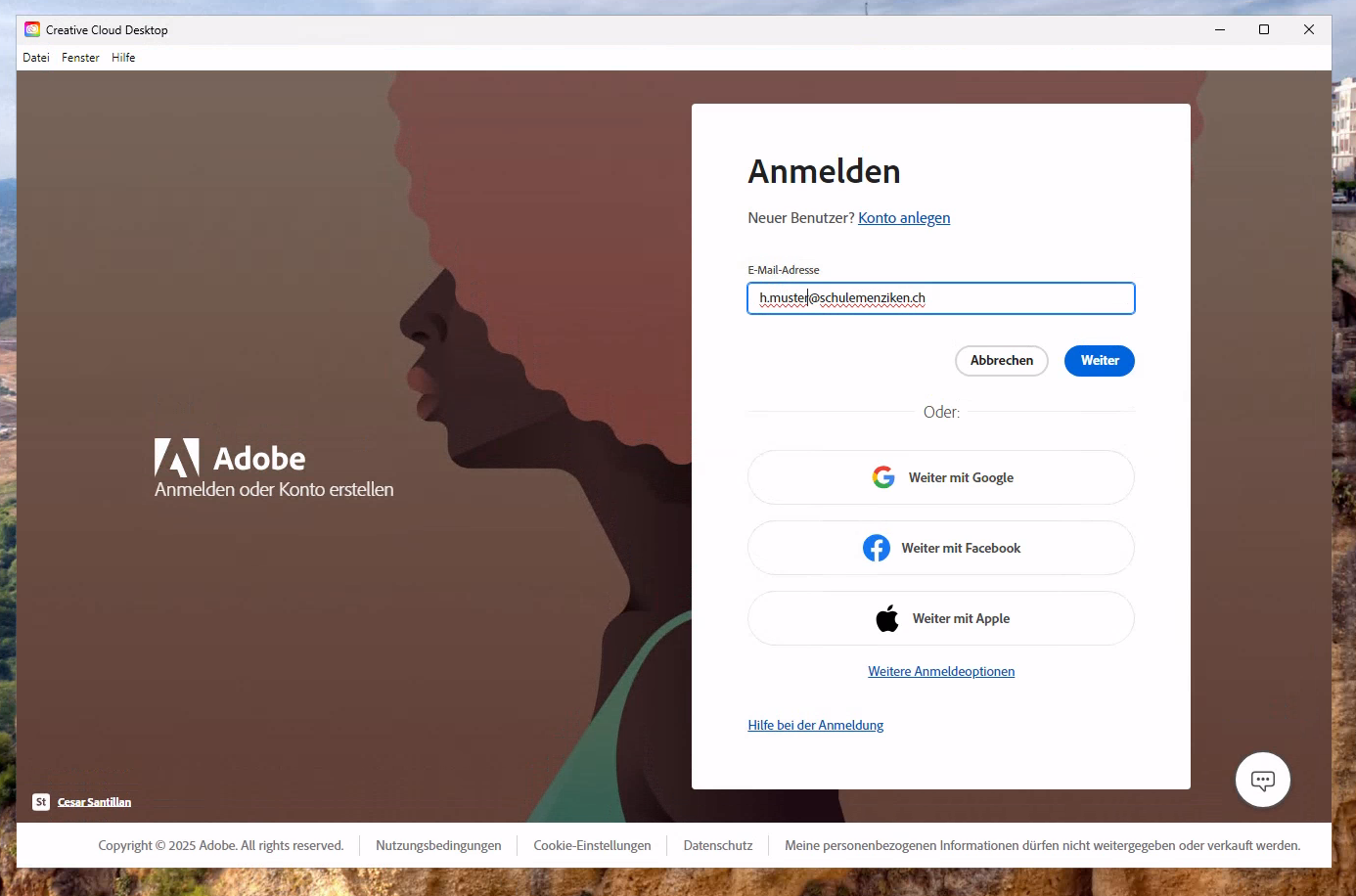 Lehrpersonen der Schule Menziken steht auch ein Adobe Creative Cloud Account zur Verfügung. Für die Anmeldung wird der Microsoft Account verwendet.